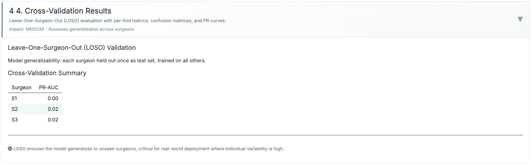 Leave-One-Surgeon-Out (LOSO) where available; otherwise session-level 5× CV with subject leakage prevented. Hyperparameters chosen by Bayesian search, then frozen.