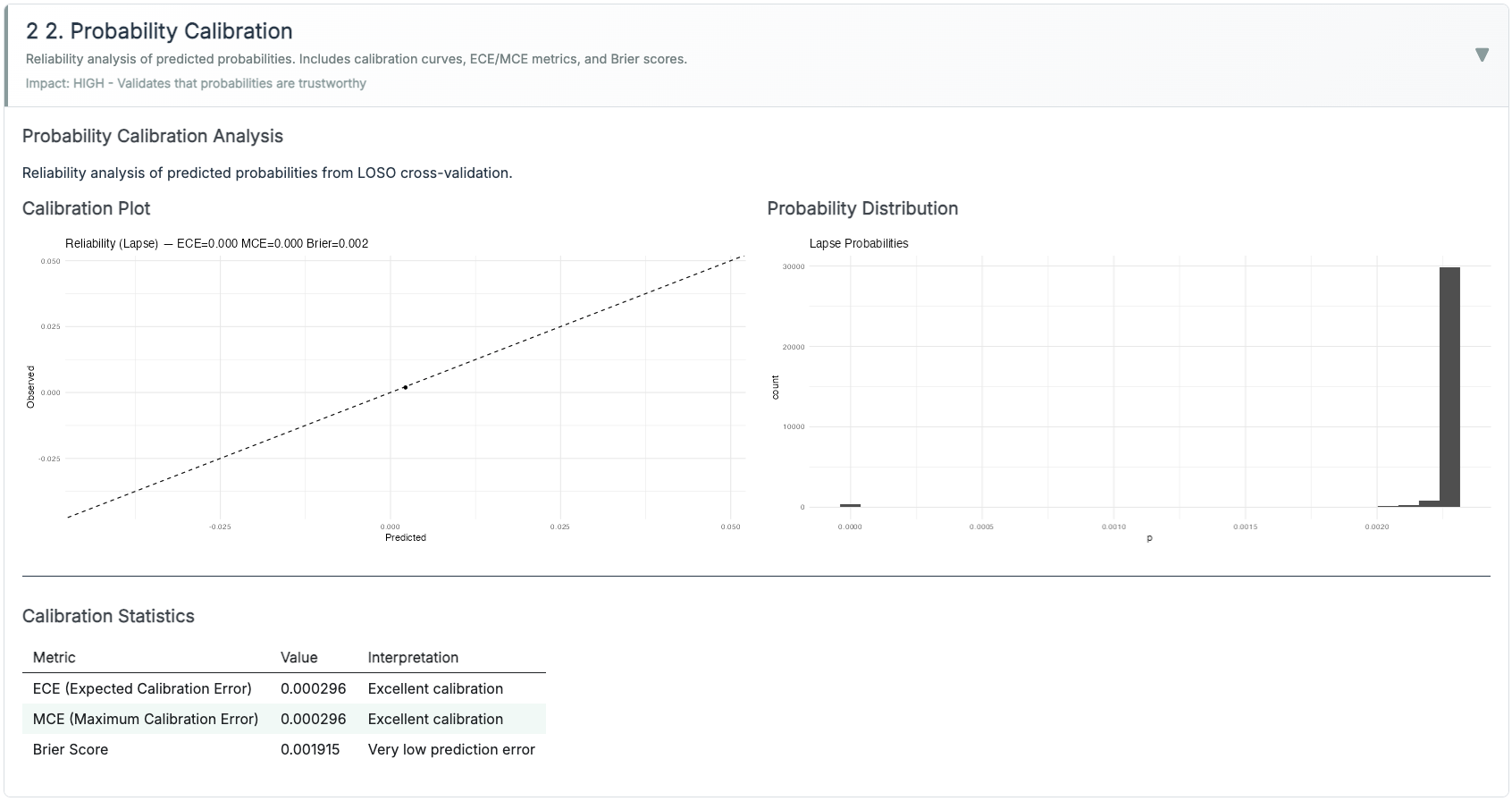 Calibration | XGBoost + Platt scaling; reliability curve (ECE/Brier) | Not model-based; exports policy defaults |