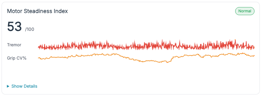 - Grip/Tremor: grip_mean_15s; grip_cv_15s; tremor_rms_10s; tremor_trend_60s.