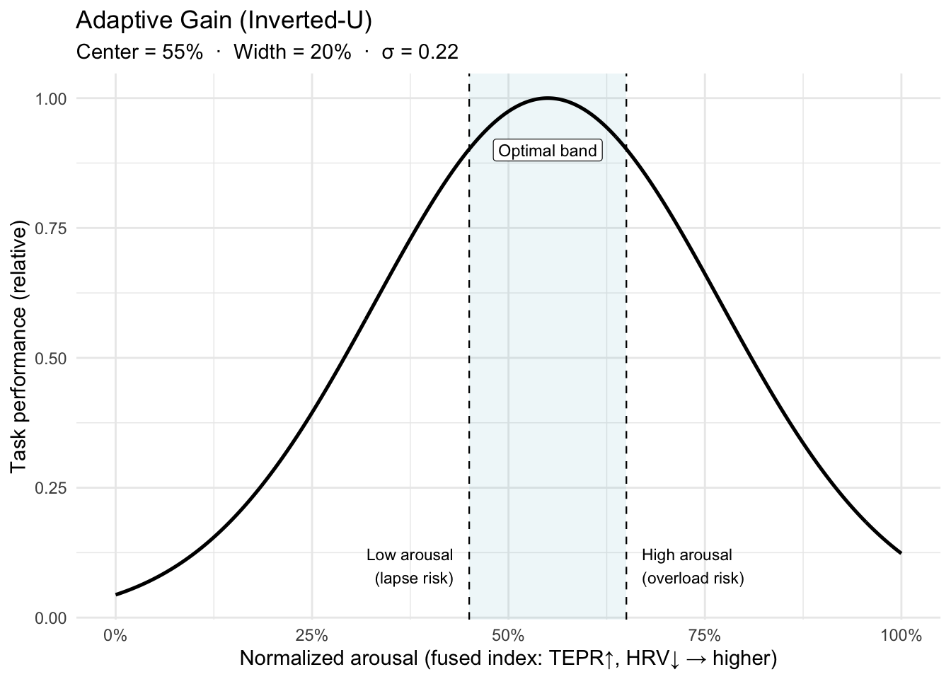 - The inverted-U is task- and person-dependent: expertise, stakes, and fatigue shift the peak (band_center) and width (band_width). That’s why we calibrate per trainee.