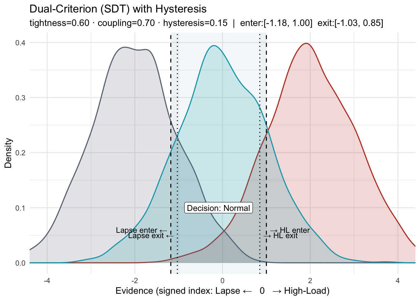- What this shows. A three-state SDT layout (Lapse / Normal / High-Load) with two decision criteria and hysteresis (separate enter/exit thresholds).