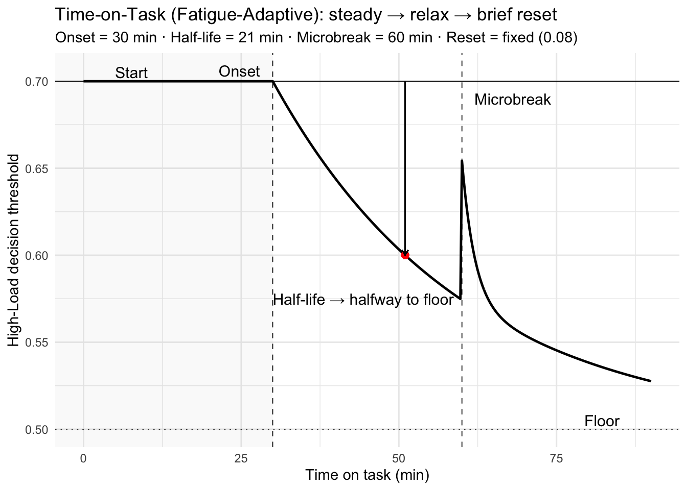 - Microbreak (t = 60 min): a small reset tightens the threshold, then decays over ~2 min. (Demo uses a fixed, modest reset.)